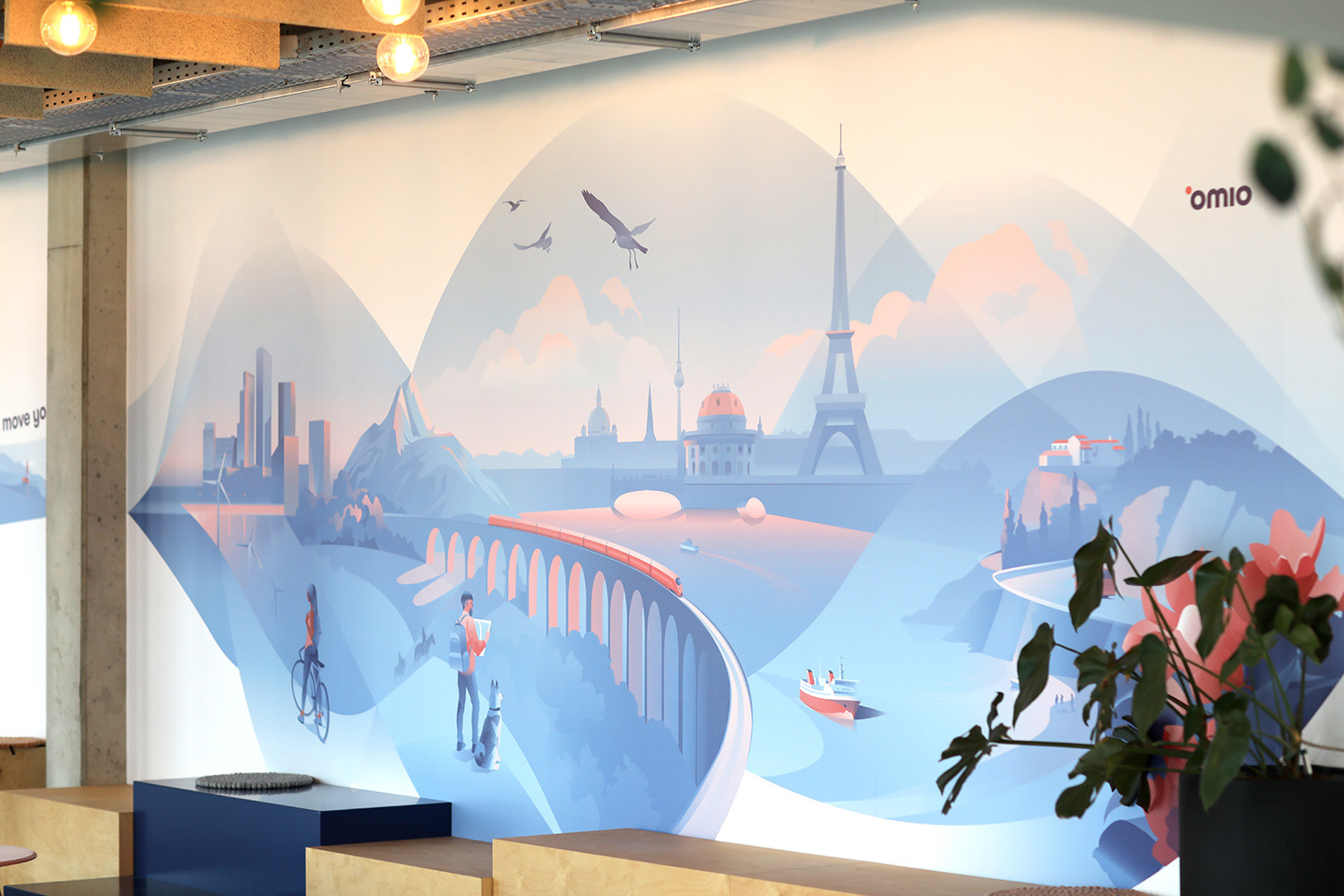 The mural for travel company Omio, 2021, office in Berlin, Germany Size: 2,6x10,6 meters