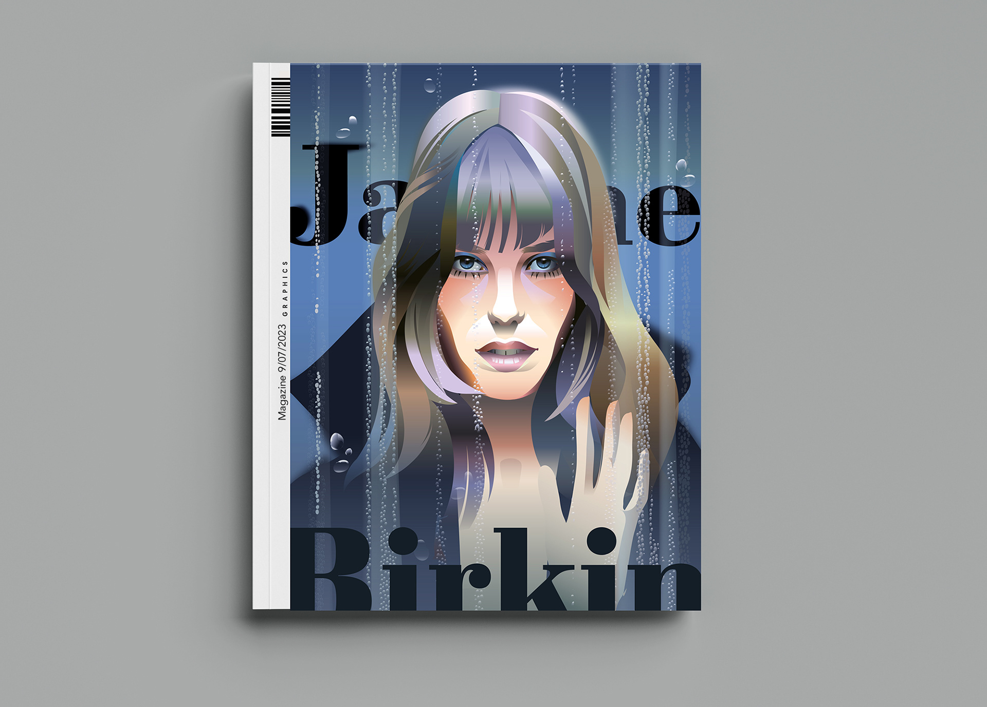 Vector portrait of iconic Jane Birkin per a magazine cover. The art inspired by her enduring charm and legacy.