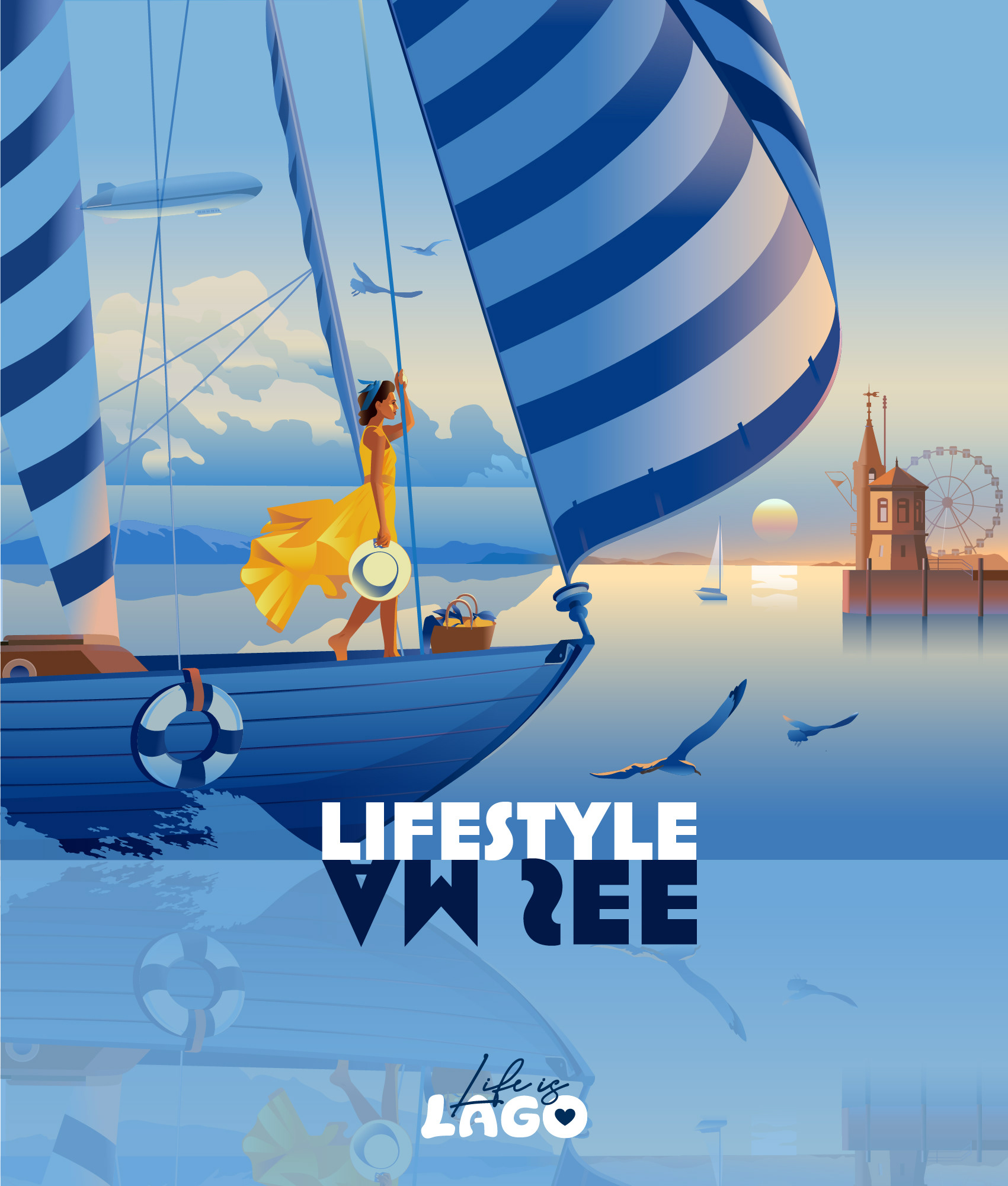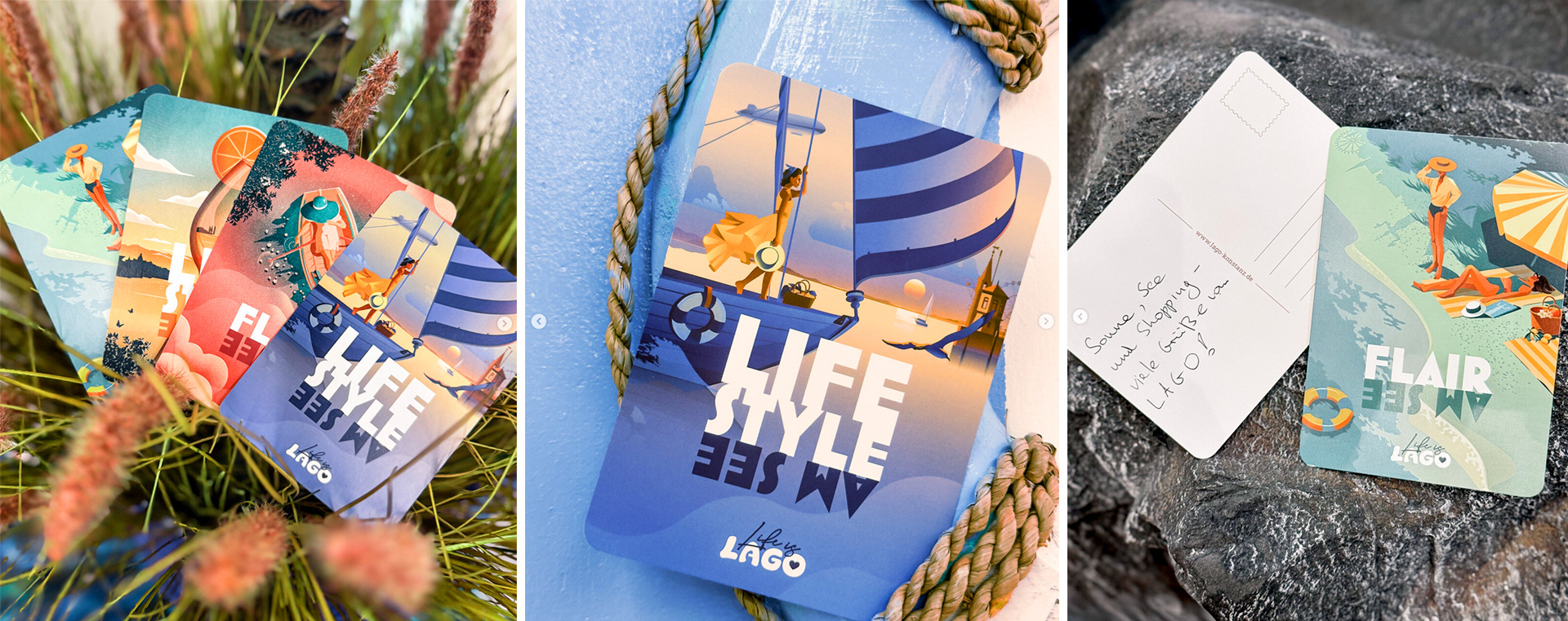 A series of retro-inspired illustrations for Sehnsuchtsort LAGO in Constance, bringing the charm of classic travel posters into today. The artworks rolled out across postcards, posters and digital — celebrating summer as a season of light, joy and discovery, and showing LAGO as a place where memories are made.
